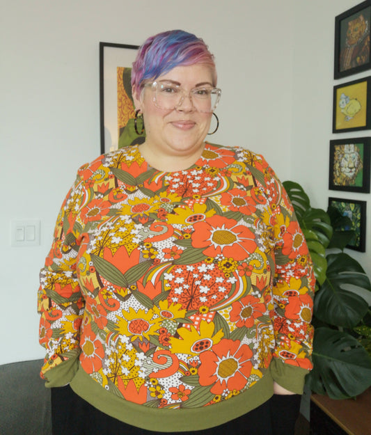 Groovy Floral Pullover in Orange & Olive: one left, size XS