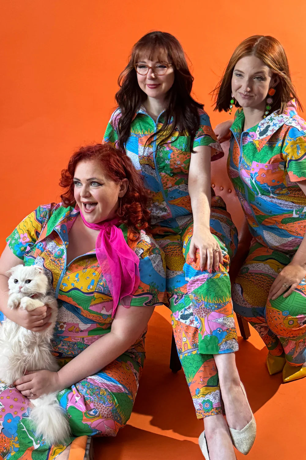 This incredible jumpsuit features the Blue Platypus original 70s-inspired landscape print bursting with animals, and trees in a gorgeous bright palette!