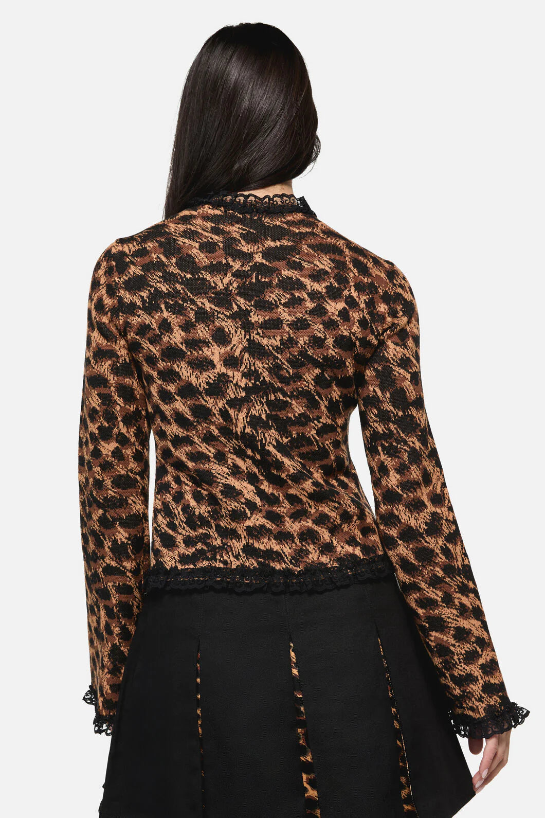Stay cosy this winter while fulfilling all your 90s throwback fantasies in the Leopard Nostalgia Cardigan. Leopard knit with a lace trim, bell sleeves and a velvet tie, this cardigan is the stuff dreams are made of.