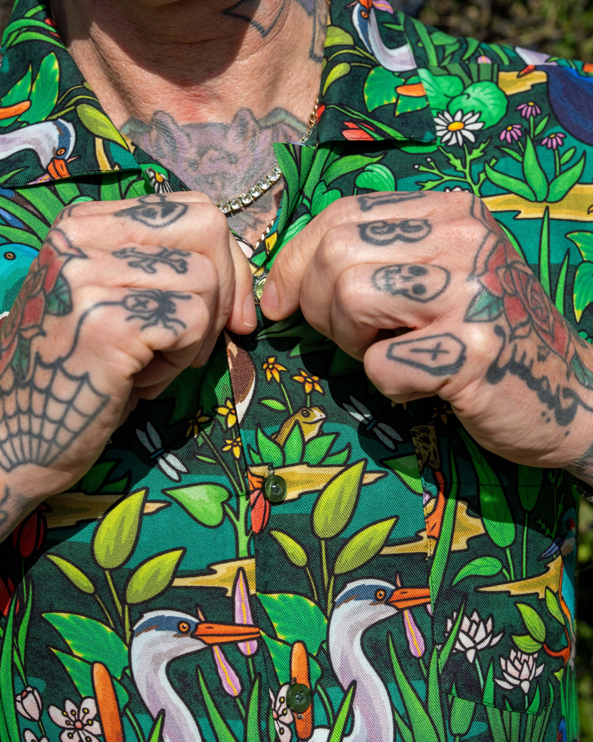 Ready to ruffle a few feathers? Our Pond Birds Resort Shirt is an explosion of colour and character, featuring Wafflemama's whimsical print packed with herons, kingfishers, ducks, and dreamy pond flora.